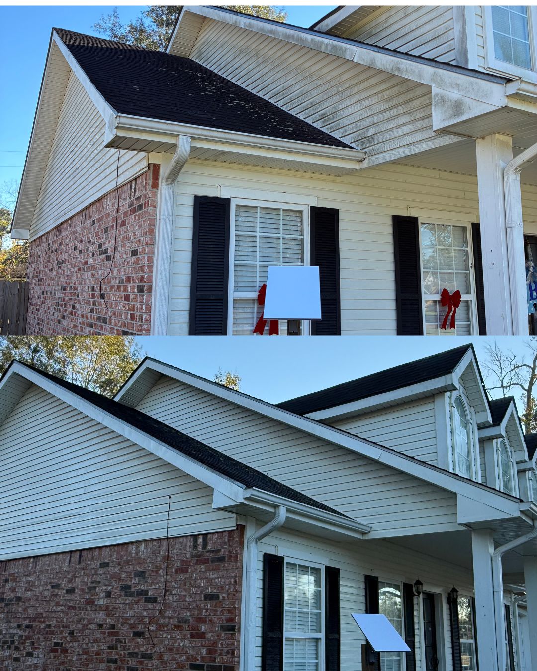 Gutter cleaning removes leaves, debris, and clogs to ensure proper water flow and prevent structural damage. Gutter brightening uses specialized cleaners to remove dark "tiger stripes" caused by oxidation, dirt, and algae, restoring the gutters' original appearance and enhancing curb appeal.